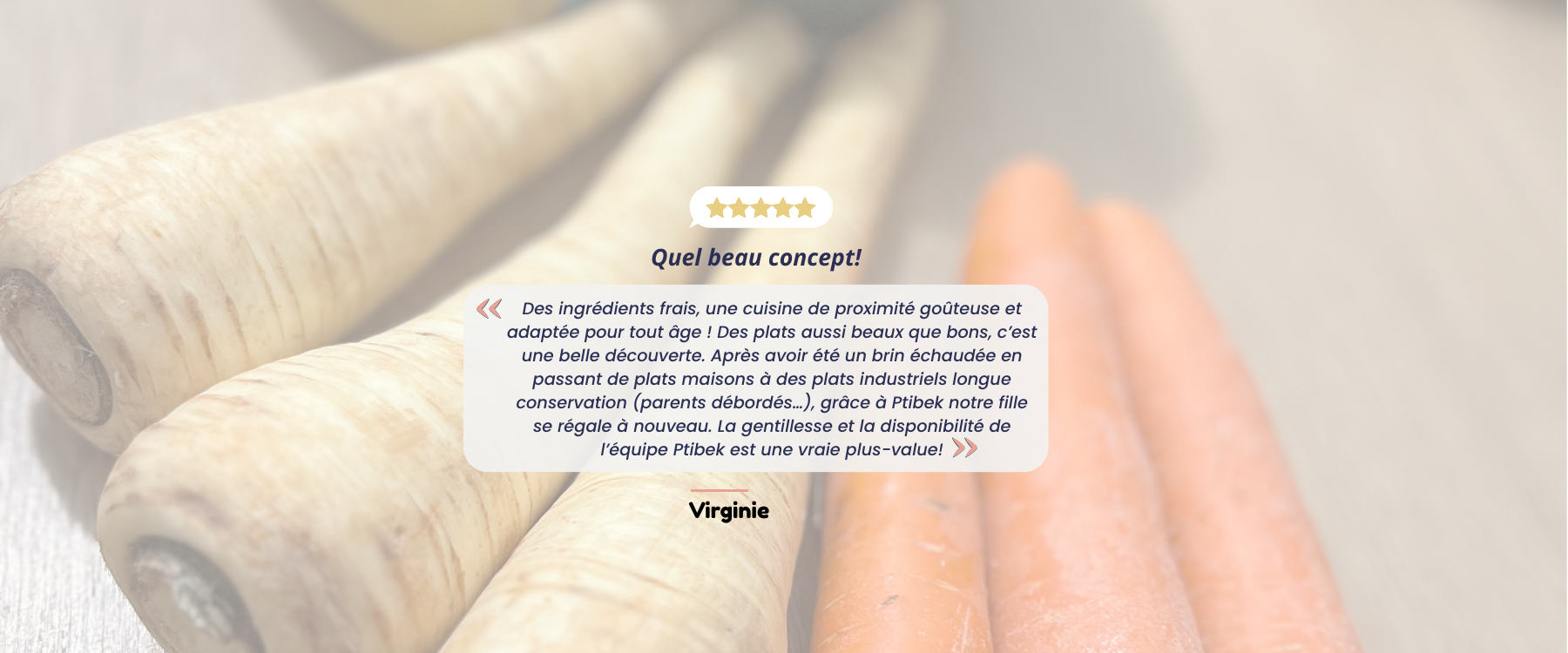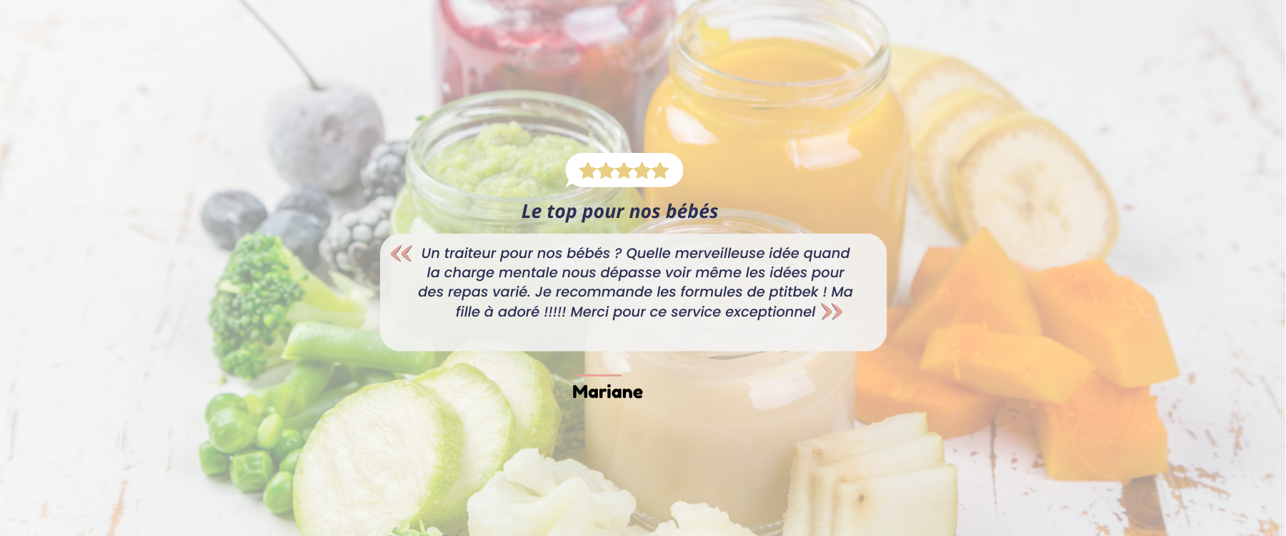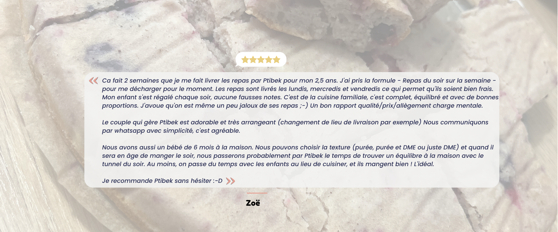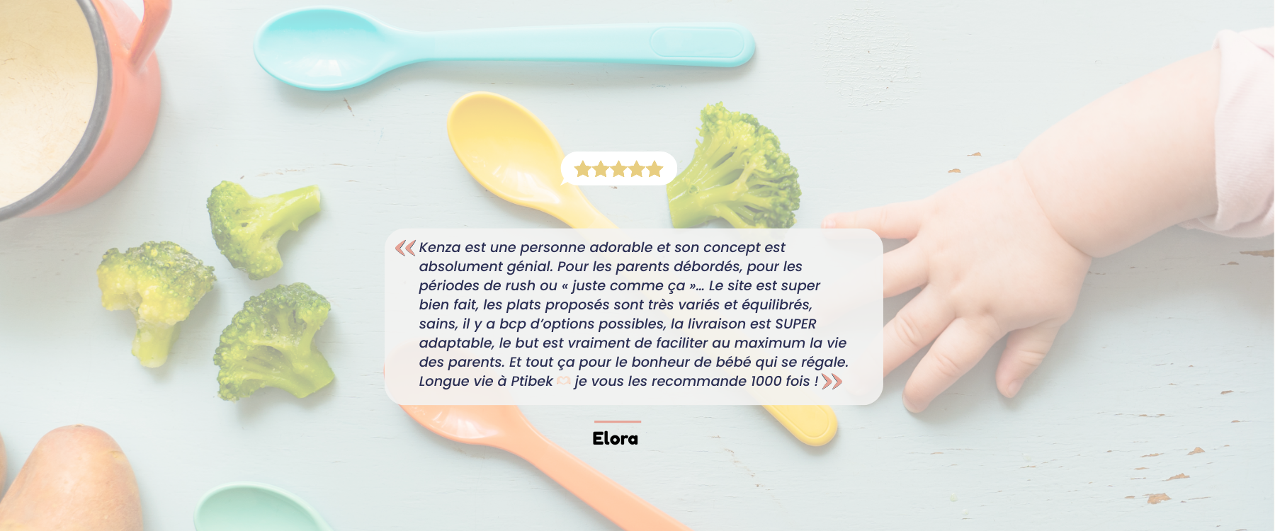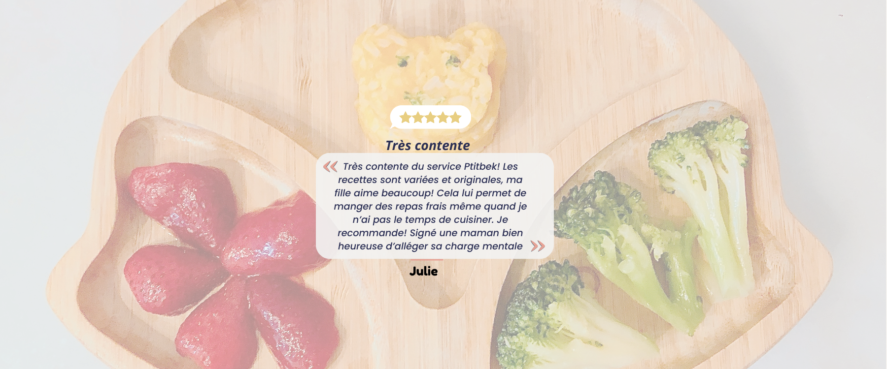 Né d’une passion et d’un profond amour pour nos tout-petits, Ptibek est là pour être l’épaule de soutien de toutes les familles. Nous savons combien les repas de bébé peuvent être un casse-tête au quotidien. Notre mission : vous offrir des repas maison, sains et savoureux, pour que vous puissiez souffler… et savourer plus de moments précieux avec votre enfant.